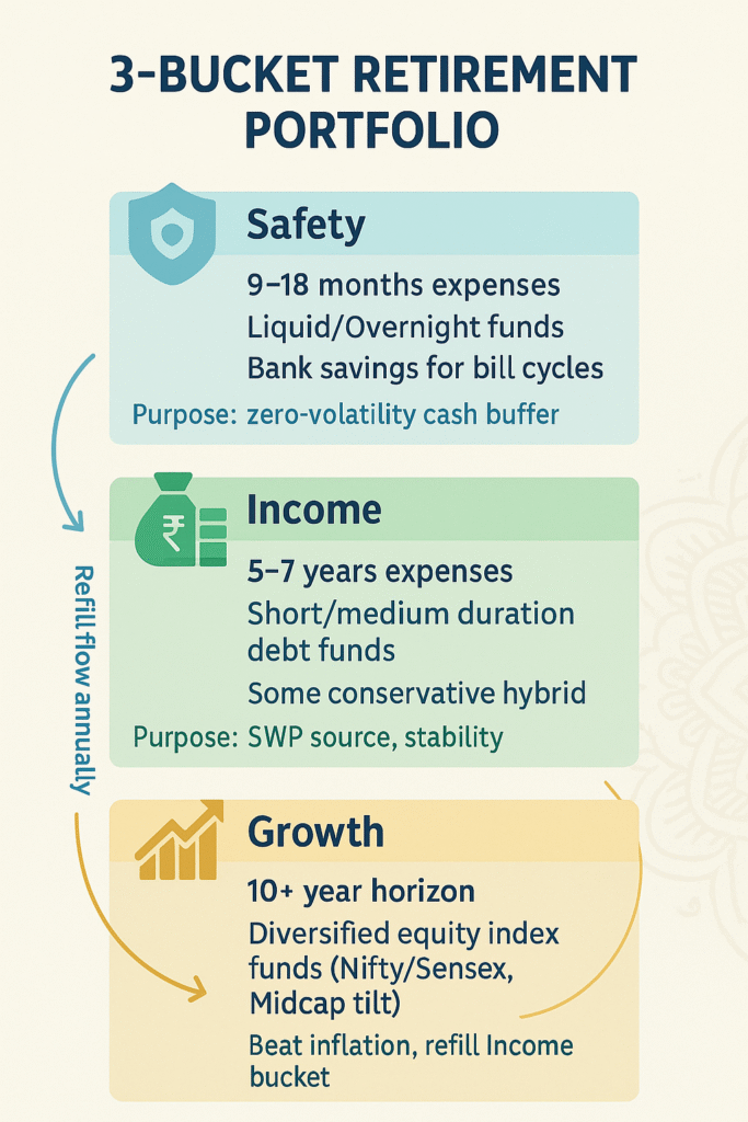 In India today, the most practical, low-cost way to do both is a core NPS for tax-efficient accumulation + annuity, and a mutual fund SWP for flexible monthly cash flow—wrapped in a simple 3-bucket portfolio.