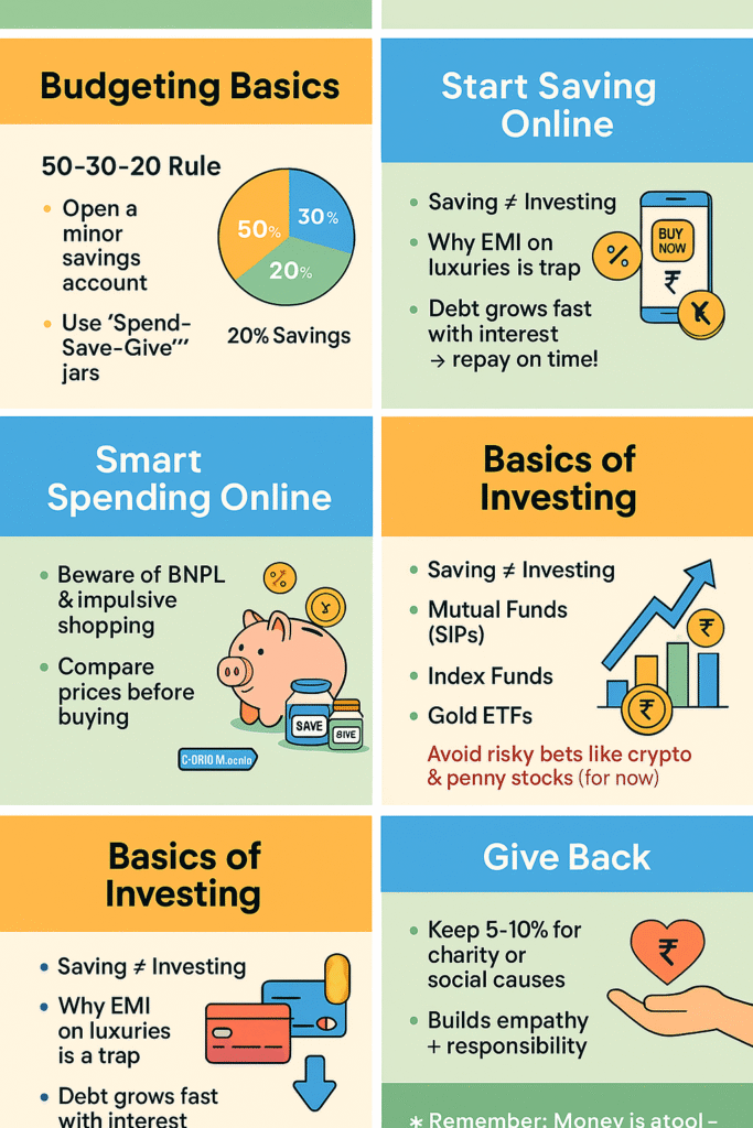 - Saving: Building funds for goals (FDs, savings accounts, small SIPs)