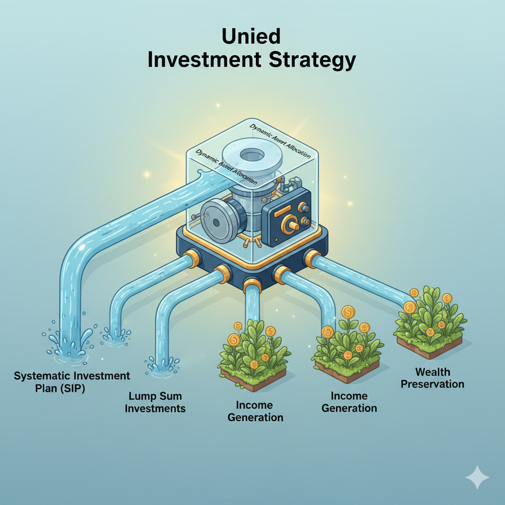 The Core Equity SIP aggressively pursues growth. The Dynamic Hybrid SIP intelligently manages risk and enhances risk-adjusted returns. The Debt SIP secures near-term goals. Together, they create a robust, self-adjusting portfolio suitable for any market condition and any income pattern.